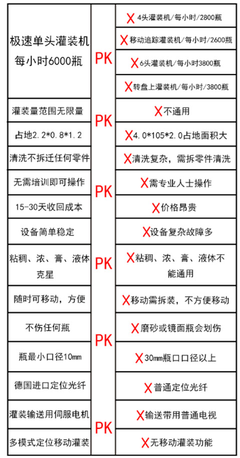 自动极速灌装机具防滴漏灌装系统:灌装时气缸上下动作,带动阀头。气缸向上运动,则闷头向上,即阀门打开,开始灌装物料;反之则停止灌装。并且杜绝滴漏与拉丝的现象。料缸、三通部分采用快卡连接,无须任何特殊工具,装卸清洗十分便捷。